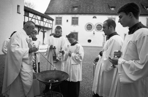 Pfarrer Wakan erteilt in der Unterzeiler Kirche den Blasiussegen. (2000) Der Heilige Blasius wird traditionell als Fürsprecher bei Hals- und Atemwegserkrankungen verehrt. Der Segen bittet um Gottes Schutz…