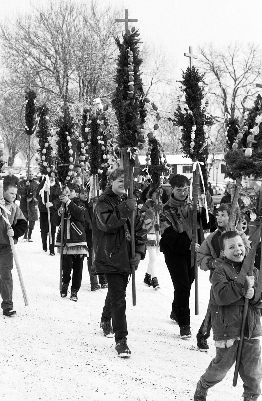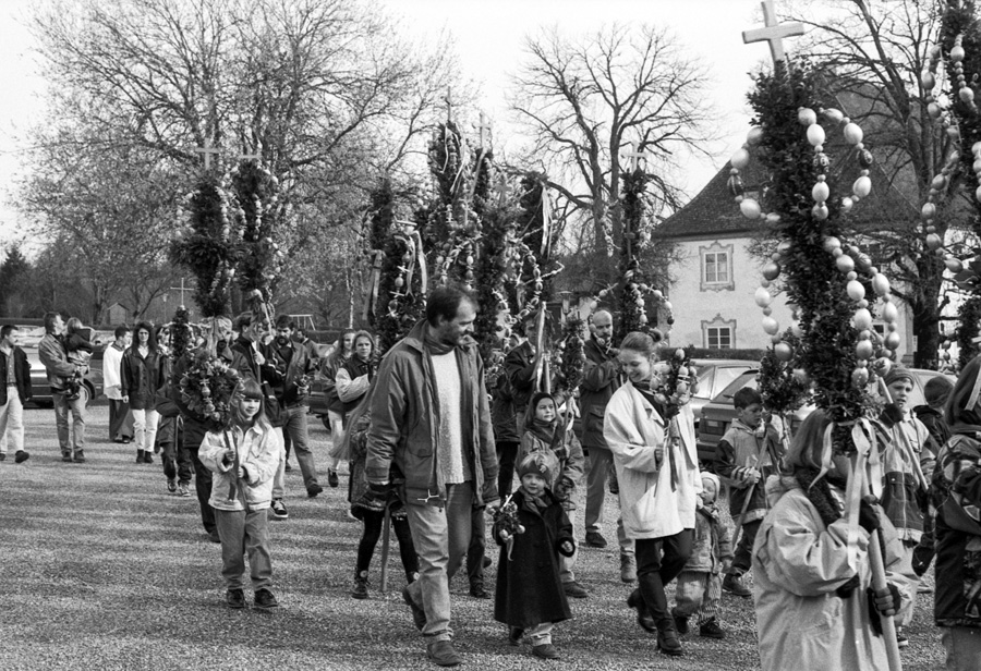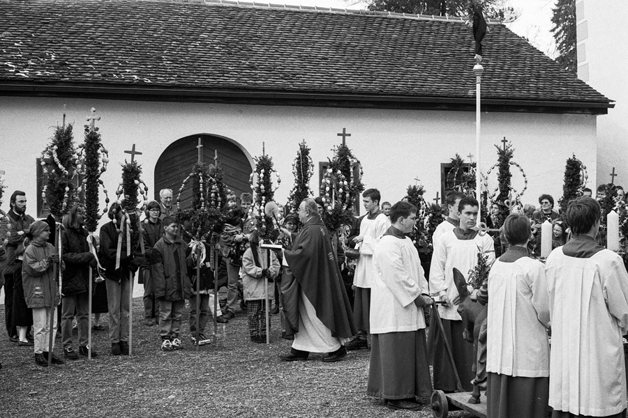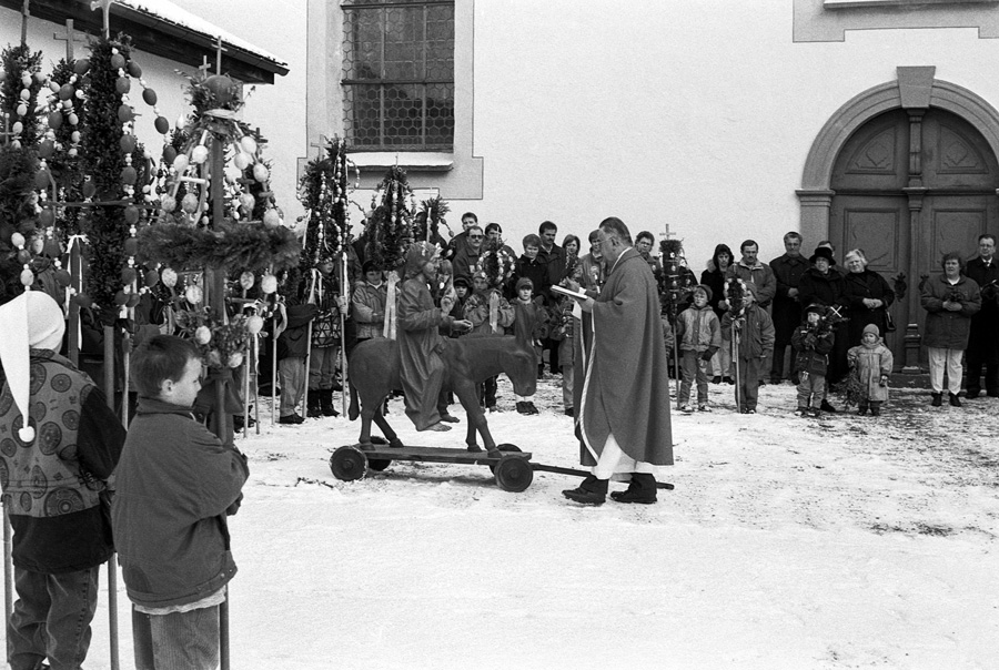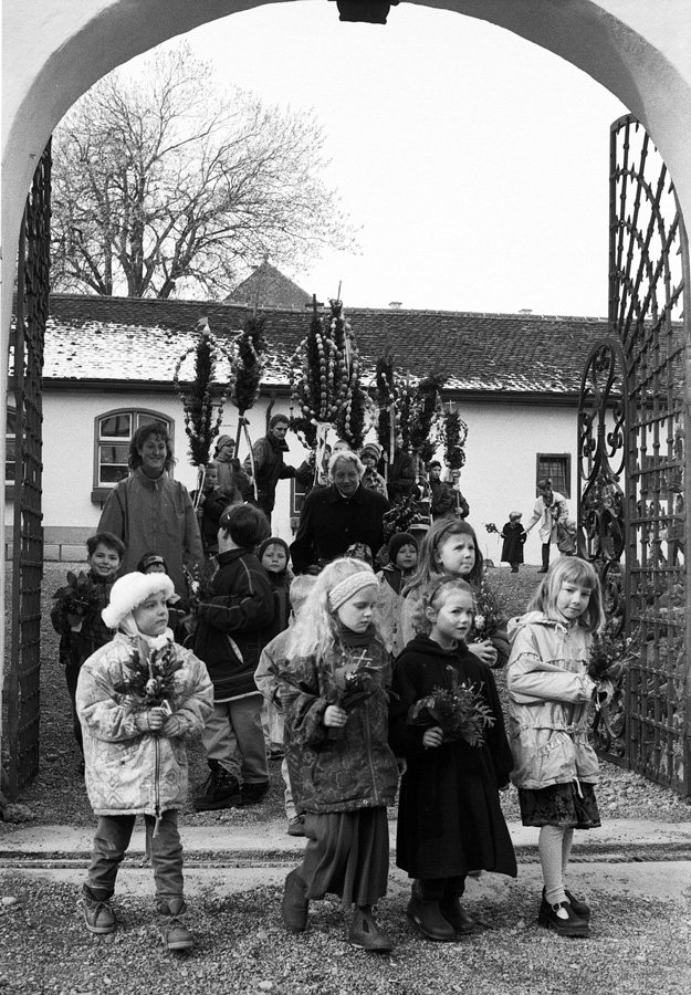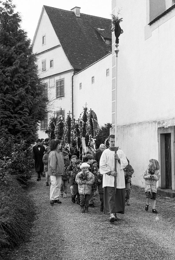 Die Kinder und Jugendlichen der Gemeinde gestalten die »Palmen« und tragen diese in einer kurzen Prozession vom Stiftshof in die Kirche Sankt Maria auf Schloß Zeil, wo diese in Halterungen an den Kirchenbänken gesteckt werden und die über Osterzeit dort verbleiben.